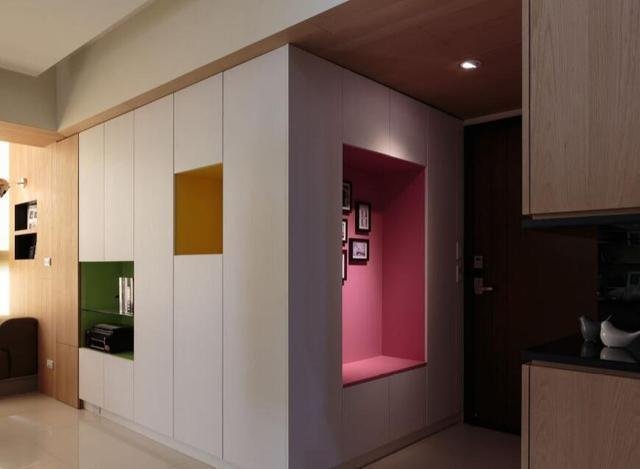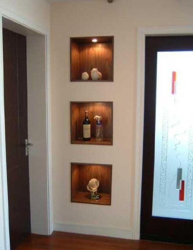 作為第一眼看到的地方,這里除了要保持干凈整潔更要彰顯家里的品味。而安裝幾個(gè)玄關(guān)柜不但占用空間還沒(méi)有任何裝飾性,不如學(xué)一下現(xiàn)在流行的這種設(shè)計(jì)。只需在墻面挖幾個(gè)洞再安上一些筒燈,擺上一些裝飾品或是私人藏品,這樣普通的一個(gè)小角落就能變得十分有品味。