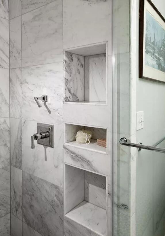 這個(gè)地方是最不適合買柜子了。由于這里的環(huán)境常年潮濕木制品很容易受潮變形,相比之下這種挖洞設(shè)計(jì)就顯得很實(shí)用。它即不易生銹變形而且打理起來(lái)也很方便。而除了淋浴區(qū)我們也可以在洗漱臺(tái)周圍或是如廁區(qū)做這樣的設(shè)計(jì),不占空間拿取又方便。