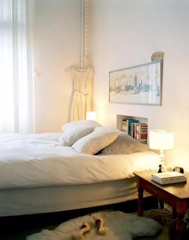也許有些人有閱讀的習(xí)慣,每次臨睡前還要到書(shū)房拿書(shū)也很不方便。不如在臥房也做一個(gè)壁龕,這樣不占地方還可以把??吹臅?shū)籍放在這里。而且除了書(shū)籍我們也可以放一些裝飾品或常用的小物件,比起床頭柜更實(shí)用一些。