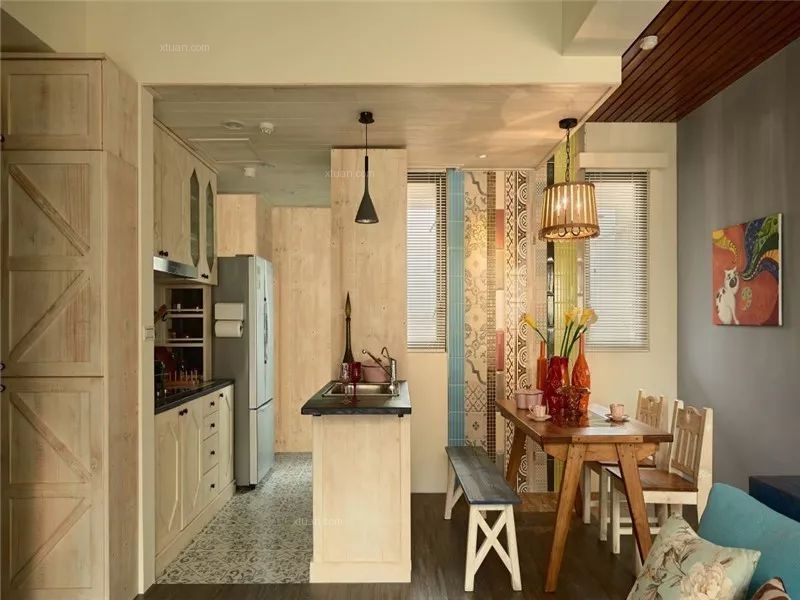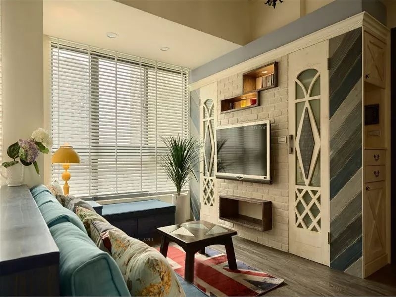 快節(jié)奏、繁華的城市當(dāng)中,總希望有安靜的棲息之地,感受到安逸舒適自由的生活,深色地板結(jié)合彩色家居搭配結(jié)合,空間區(qū)域?qū)Ρ葎澐置鞔_,使空間充滿世外桃源之感,水藍(lán)色的美式沙發(fā)拉高客廳清爽度,搭配國(guó)旗圖樣的地氈與碎花抱枕,增添度假風(fēng)格。
